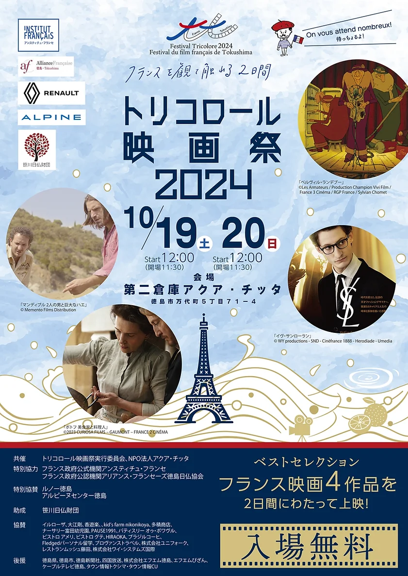 トリコロール映画祭2024 上映内容 ●10月19日(土) 「ポトフ 美食家と料理人」 「ベルヴィル・ランデブー」 ●10月20日(日) 「マンディブル」 「イヴ・サンローラン」 …